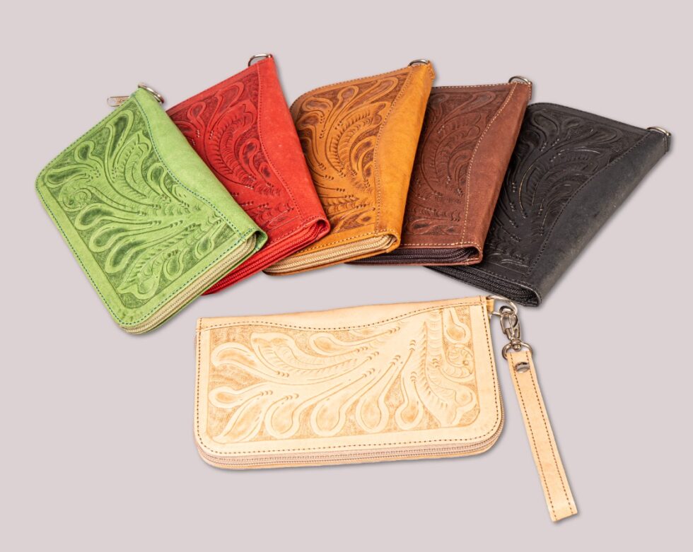Billetera larga de cuero repujado. Con cierre.