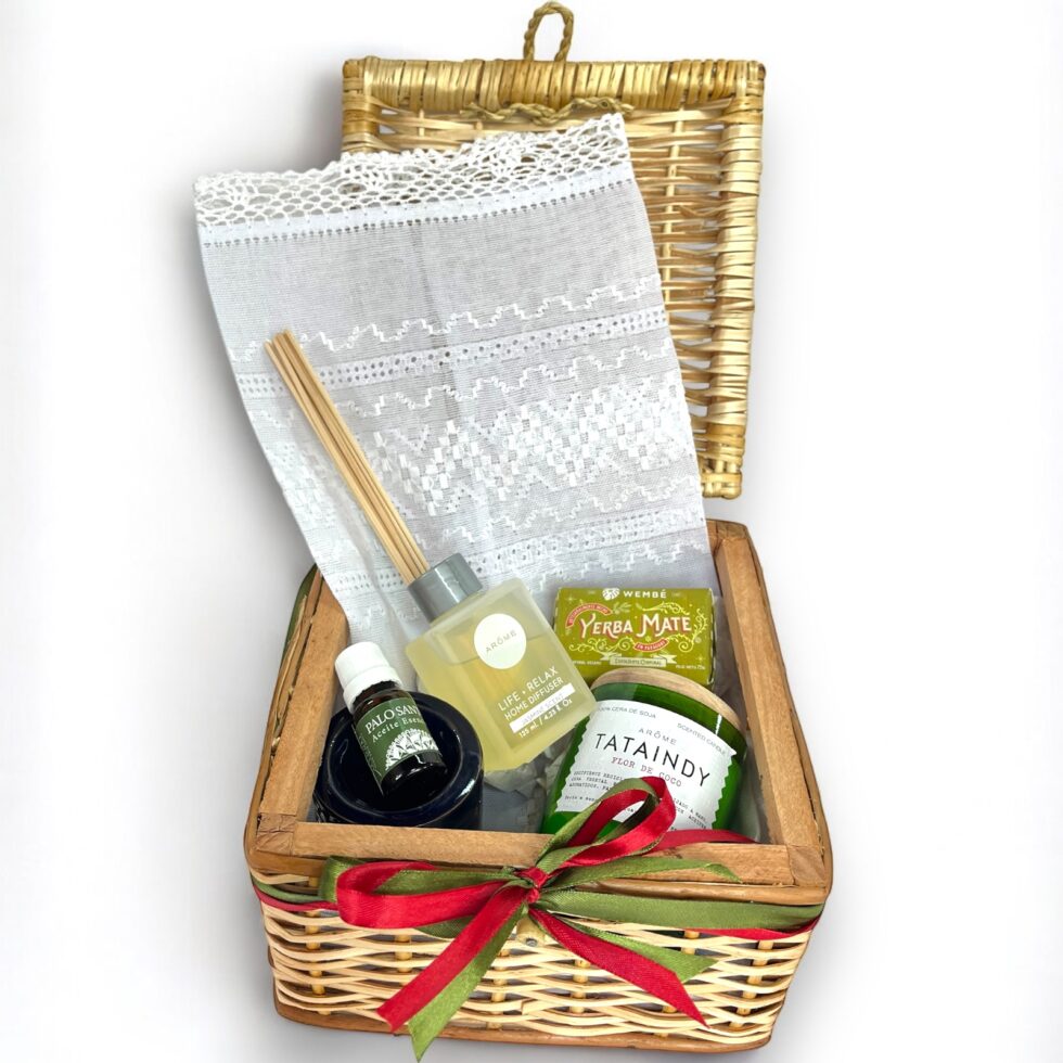 Contiene: Toallita de Ao Po’i 80.000, Horno de Cerámica Esmaltada 70.000, Aceite de Palo Santo 50.000, Vela de Flor de Coco 80.000, Difusor de Jazmin 65.000, Jabon de Yerba Mate 25.000 caja de mimbre 110.000