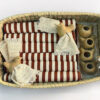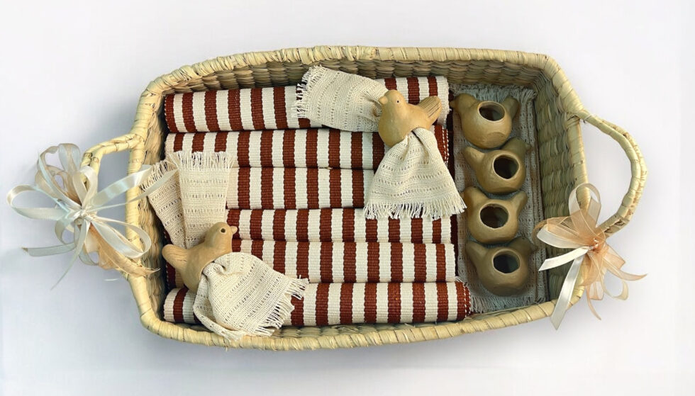 Contiene juego de 6 Individuales 25.000 c/u y servilletas de telar 4.000 c/u con 6 Servilleteros de Palomitas en cerámica 15.000 c/u Canasta 70.000