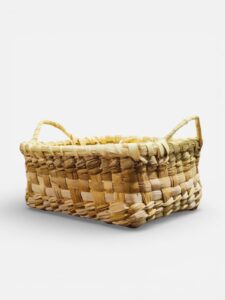 Cesto confeccionado artesanalmente por la parcialidad Mby´a con de hojas de palma. Medidas: ancho 25cm, alto 7cm.