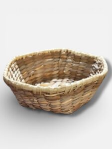 Cesto confeccionado artesanalmente con de hojas de palma. Medidas: 7cm altura, diam 19cm.